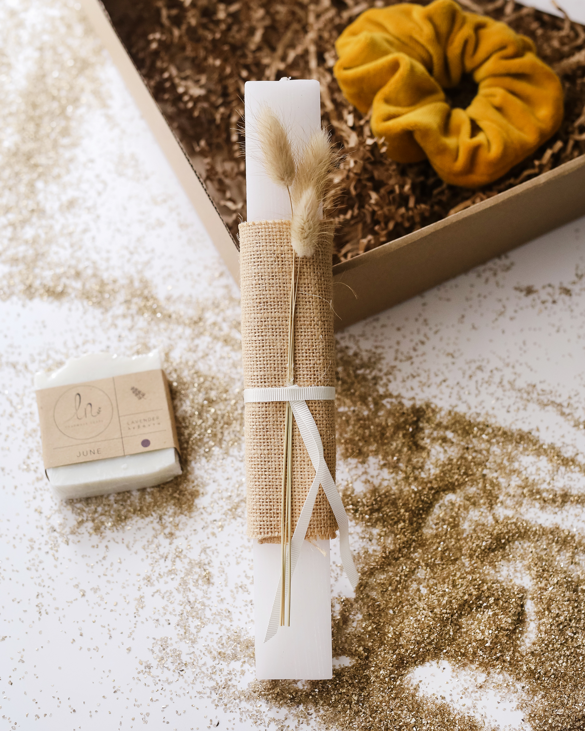 Χειροποίητη λαμπάδα κούτι με σαπούνι και scrunchie λαστιχάκι