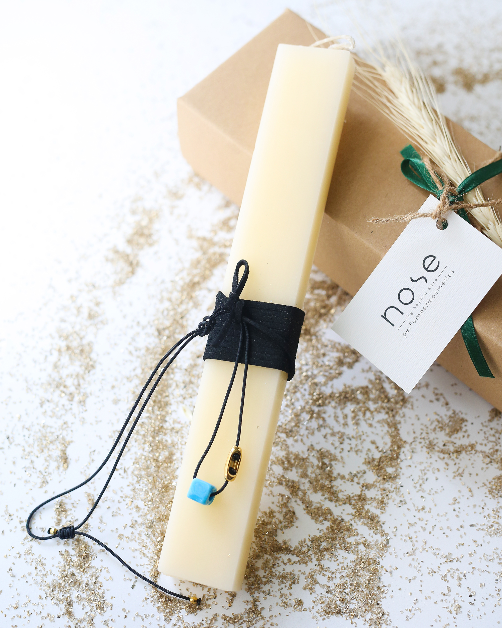 Χειροποίητη λαμπάδα σε κουτί , στολισμένη με κρεμαστό λαιμού,κορδόνι με γαλάζια χάντρα .